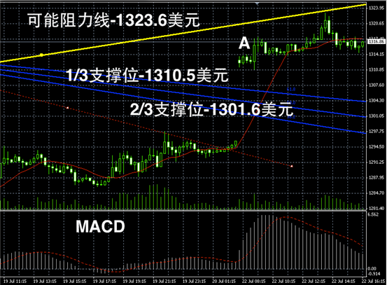 黄金价格反弹之后,已经来到了Fibonacci低位区间的阻力线附近,即1320美元附近,未来这一阻力线或较难突破,因此短线黄金价格或开始区间震荡。整体长线macD空头也已经消散殆尽,且RSI上升至59附近,未来或进入超买区域,因此黄金价格能否在1300美元以上持稳而不回落则比较重要。