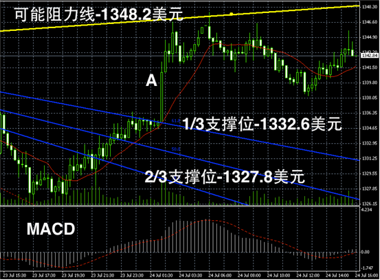 黄金长线阴阳烛录得进一步上行,且穿过了Fibonacci低位区间阻力线,长线MACD显示空头已经完全消散,弱势多头开始积聚,且RSI上行至65,在未触及70之前,预期黄金仍有部分上行空间,短线黄金或冲击1350美元附近的阻力线,若冲击成功则可能进一步大幅上扬,否则或开始回落持稳。