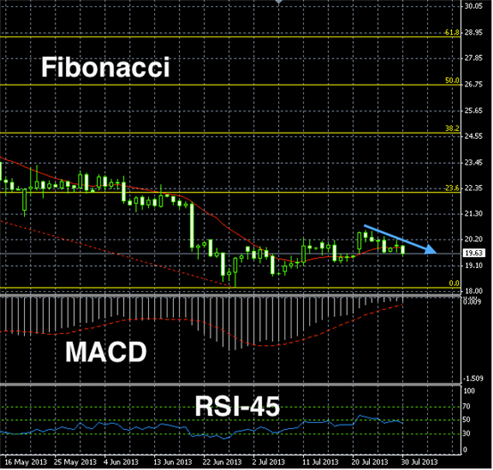 黄金长线阴阳烛在Fibonacci低位区间阻力线附近的焦灼状态比较明显,预期或继续在1320 – 1330 美元区间窄幅震荡。不过由于多日反弹不能突破阻力线,且RSI录得下行至57附近,所以短线偏空下行的几率在增加。