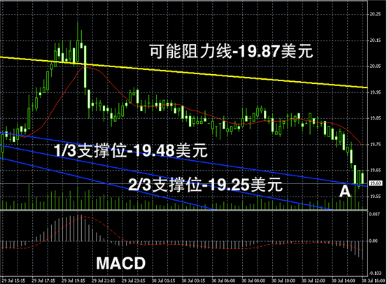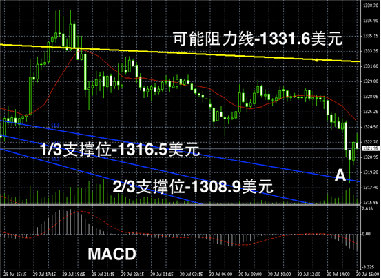 黄金阴阳烛末端录得大幅低于红色日平均移动线,且连续录得长阴烛出现,短线MACD显示弱势空头主导,预期或继续偏空震荡,低位支撑可参考阴烛A的最低价,若跌破则继续下行,否则或区间反弹。