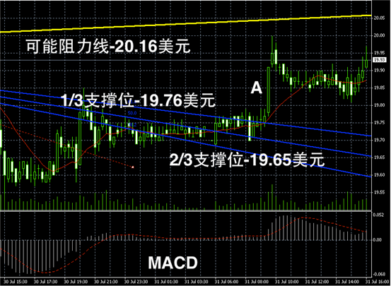白银阴阳烛录得小幅跳涨后,柱体录得收短,且平均分布在红色日平均移动线中位,短线MACD显示弱势多头主导,预期或继续在20美元上下整理震荡,震荡区间可参考阳烛A的高低价。