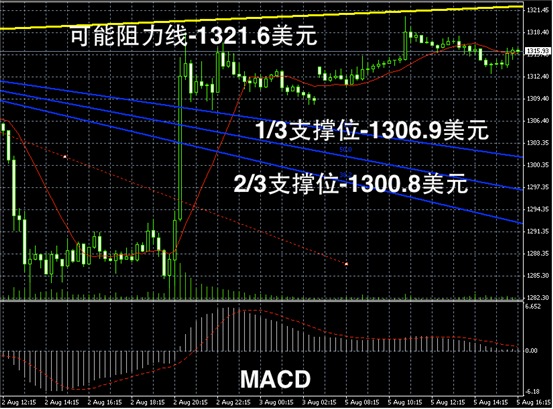 黄金阴阳烛录得柱体较短,且平均分布在红色日平均移动线中位,短线MACD显示弱势多头主导,预期或继续在1310美元上下窄幅整理。