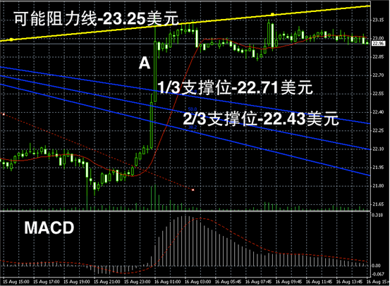 白银阴阳烛录得柱体收短,且平均分布在红色日平均移动线中位,短线MACD显示多头有所消散,预期白银价格或在23美元附近窄幅震荡。