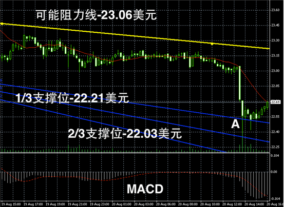 白银长线阴阳烛末端录得长阴烛,且跌至Fibonacci区间支撑位附近,长线MACD显示弱势多头主导,RSI则转为下行至71,仍在超买区域,预期或在70附近持平后,白银价格低位支撑可能在22.3美元附近。