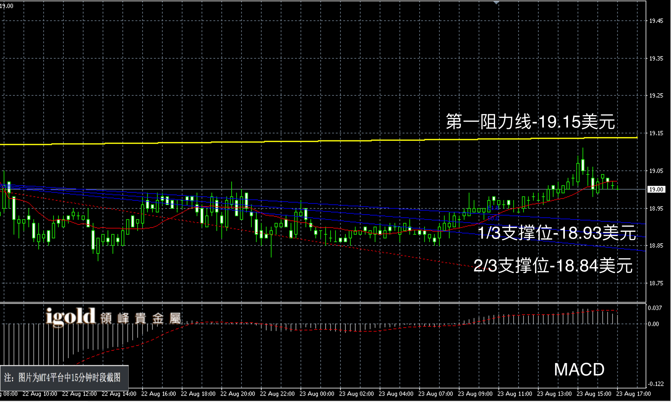 白银阴阳烛录得柱体较短,末端处于红色日均线中位,短线MACD显示弱势多头主导,白银价格晚上或小幅回调至19美元附近徘徊,高低多空扩大信号可分别参考19.1和18.9美元附近。