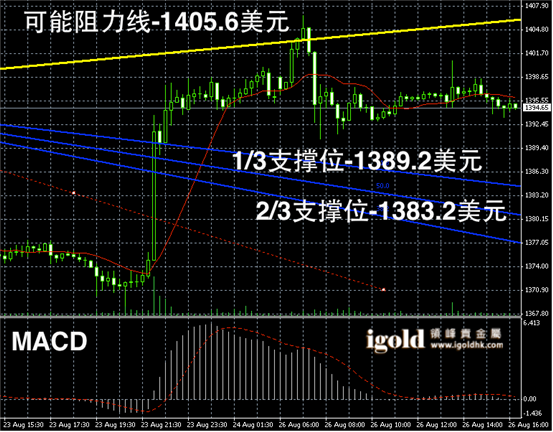 黄金长线阴阳烛录得来到Fibonacci第二区间后,录得阴烛出现,长线MACD弱势多头主导,RSI则收平在70附近,没有明显的上行趋势,预期或首先在1400美元高位附近持稳震荡。