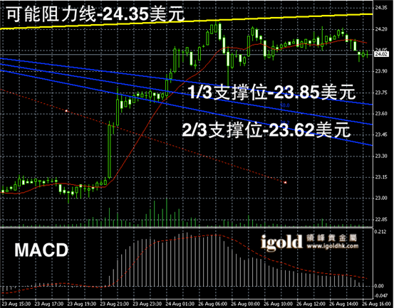 白银长线阴阳烛录得来到Fibonacci第二区间后,仍旧阳烛出现,且长线MACD继续见长,RSI则小幅上扬至80附近,预期白银或进一步曲折上行至24.3美元附近。