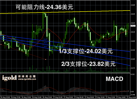 白银阴阳烛录得比较平均,且整体处于红色日平均移动线中位,短线MACD震荡趋势呈中性,预期短线或继续在24.3美元附近做宽幅的震荡调整。