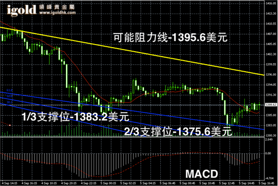 黄金阴阳烛录得阴烛较多,且短线MACD弱势空头主导,预期黄金价格短线或继续在1380 – 1400 美元区间内修正,如果美国数据录得向好,金价或可能再次承压下行。