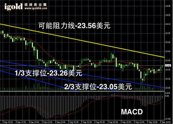 白银长线阴阳烛录得柱体跌破了红色日平均移动系统,不过末端录得十字星,长线MACD录得DIF线收短,长线RSI下跌至57,白银价格预期或继续在23 – 24美元偏空震荡。