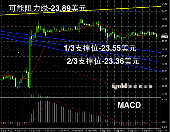 白银长线阴阳烛录得在Fibonacci区间中位整理,MACD则小幅下降,RSI则录得在58附近,白银目前也正转入偏空状态,不过23.5美元附近的支持依然较强。