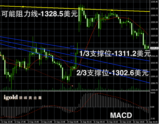 黄金阴阳烛录得阴烛增多,且短线MACD录得空头增加,柱体低于红色日平均移动线,预期黄金价格或下行探测支撑位。
