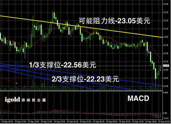 白银阴阳烛录得阴烛小幅增加,且开始低于红色日平均移动线,短线MACD仍然呈中性,收盘前白银价格或仍在23美元附近窄幅盘整。