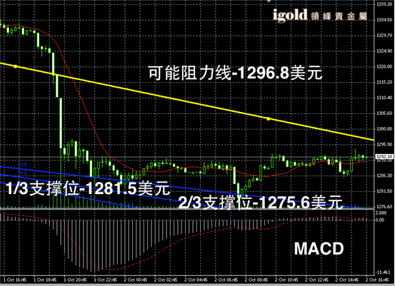 黄金阴阳烛录得柱体较短,且平均分布在红色日平均移动线中位,短线MACD显示称中性,后期黄金价格或继续在1280 – 1300 美元区间内窄幅持稳。不过整体上仍然有弱势空头的压力。