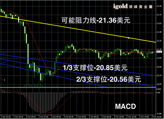 白银阴阳烛反弹后,确定了21美元附近的支撑位,不过柱体较短,短线MACD呈中性,显示暂时持稳。后期或继续在区间内窄幅偏空震荡。