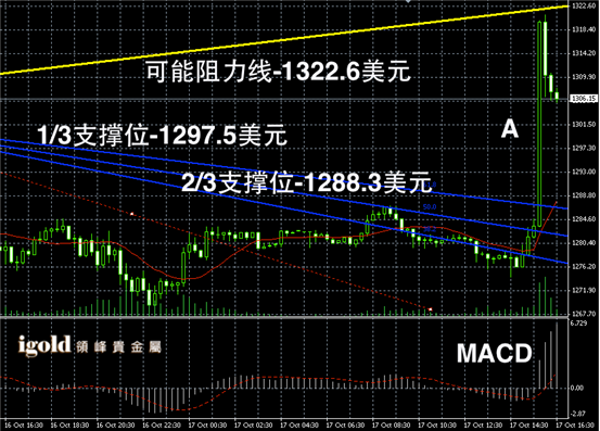 黄金阴阳烛短线录得阳烛出现,且短线MACD显示多头大幅增加,短线黄金价格或以阳烛A的高低价为参考进行新的区间探索。