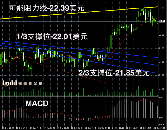 白银阴阳烛录得后期柱体小幅高于红色日平均移动线,短线MACD显示弱势多头主导,柱体整体阳烛较多,但仍然较短,后期白银价格或可能转为区间整理,预期震荡区间在22 – 22.5美元区间。