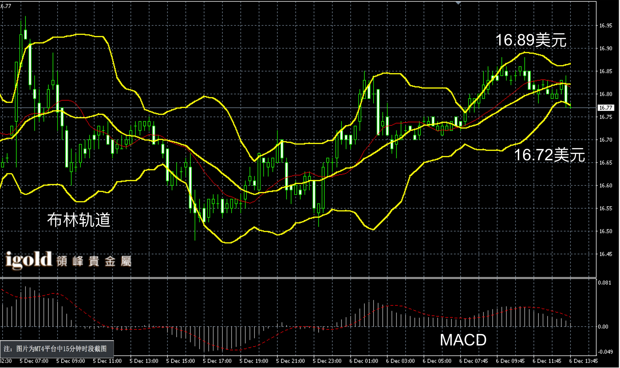 白银阴阳烛后期反弹后收短,末端高低交叉于红色日均线中位,短线MACD显示呈中性,布林轨道区间小幅收平,白银价格下午或在16.8美元附近徘徊,高低多空扩大信号可分别参考16.89和16.67美元附近。