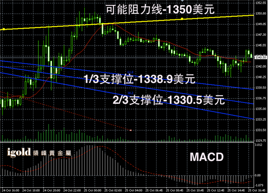 黄金长线阴阳烛录得小幅攀升后,柱体收短,处于红色日平均移动线中位,短线MACD显示多头回落,转为呈中性,后期黄金短线价格或在1340 – 1350 美元区间震荡。