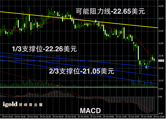 白银长线阴阳烛继续在Fibonacci第一区间阻力线附近徘徊,长线MACD转为弱势多头,RSI录得在58附近,但是有部分转为下行。后期白银价格或继续在22.6美元附近震荡。