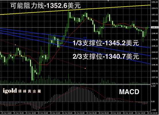 黄金阴阳烛录得柱体前后高低交叉于红色日平均移动线中位,短线MACD呈中性,且前后阴阳烛离散率较高,后期黄金价格或继续在1340 – 1350 美元区间窄幅震荡。