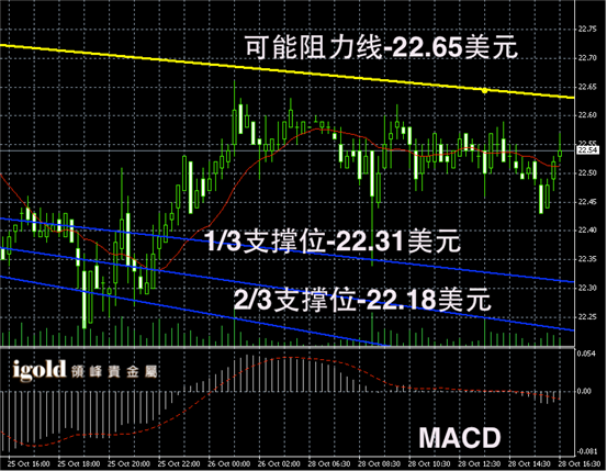白银长线阴阳烛继续在Fibonacci第一区间阻力线附近徘徊,长线MACD转为弱势多头,RSI录得在58附近,但是有部分转为下行。后期白银价格或继续在22.6美元附近震荡。