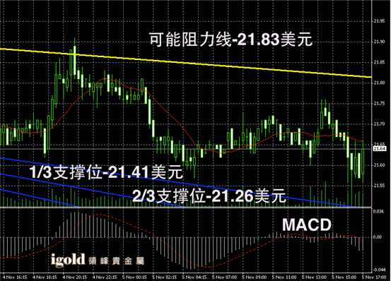 白银阴阳烛录得整体阴烛较多,后期有小幅下行的趋势,短线MACD显示弱势空头主导,后期白银价格或可能仍有小幅下行空间,直到触及21.5美元附近。