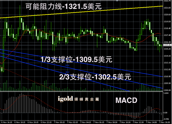 黄金阴阳烛录得柱体收短,整体处于红色日平均移动线中位,短线MACD呈中性,后期黄金价格或继续在1315美元附近震荡。
