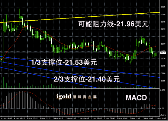 白银阴阳烛录得前后阴阳烛间隔出现,整体处于红色日平均移动线,短线MACD显示呈中性,后期白银价格或继续浮动在21.6 美元上下窄幅修正。