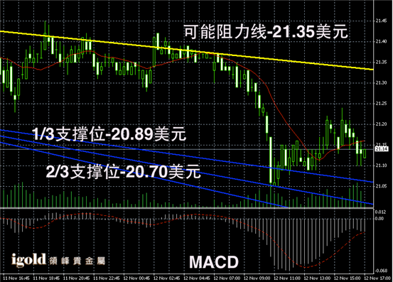 白银阴阳烛录得阴烛增多,且整体低于红色日平均移动线,短线MACD显示空头主导,后期白银价格可能继续偏空下行。