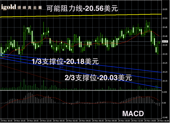 白银阴阳烛录得柱体长短平均,整体处于红色日平均移动线中位,短线MACD显示呈中性,白银价格在20 – 20.5美元附近持稳势头明显,短线或继续在这一区间窄幅震荡。