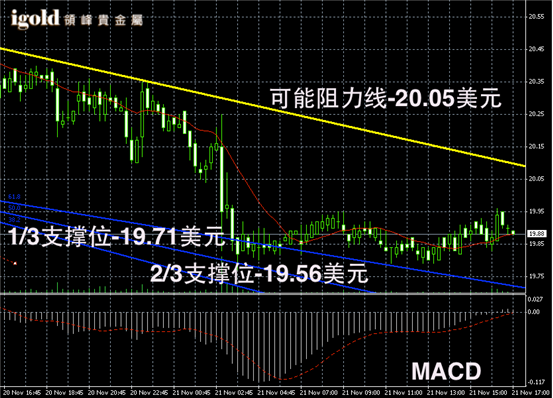 白银价格长线阴阳烛录得在跌破20美元支撑后,进入下一区间继续滑落,长线MACD显示空头集聚,RSI则录得24,已经进入超卖区域,未来白银价格可能在19.8美元附近窄幅震荡,并且有回升至20美元附近的趋势。