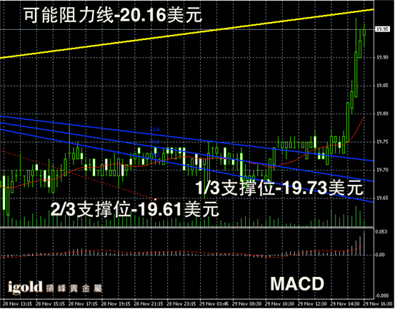 白银价格录得后期小幅上扬,阳烛增多,且柱体高于红色日平均移动线中位,短线MACD显示弱势多头,白银价格短线或尝试冲击20美元阻力线。