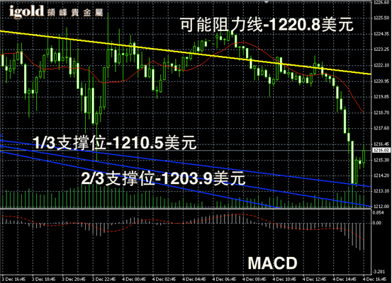 黄金阴阳烛录得柱体低于红色日平均移动线,短线MACD显示空头主导,且阴烛大幅增加,后期黄金价格或向1200美元附近滑落。