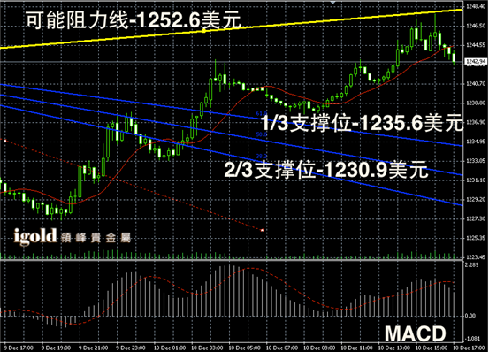 黄金短线阴阳烛录得阳烛增多,且多数高于红色日平均移动线,短线MACD显示多头集聚,后期黄金价格或继续向1250美元线附近冲击上行。