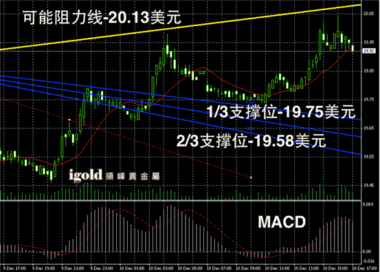 白银阴阳烛录得柱体高于红色日平均移动线,短线MACD显示多头主导,整体反弹趋势明显,阳烛录得增多,后期白银价格或在20美元附近持稳。