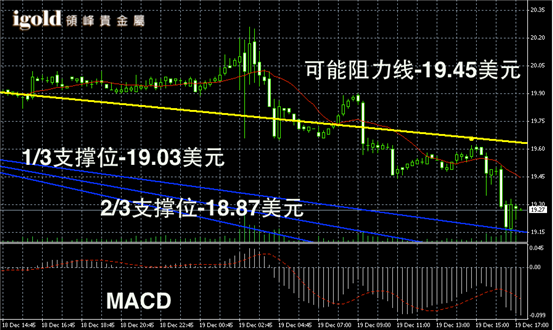 白银阴阳烛录得柱体大幅低于红色日平均移动线,短线MACD显示空头主导,后期白银价格可能进一步小幅下探,若持稳19美元,则可能区间整理,若跌破则可能继续下行。
