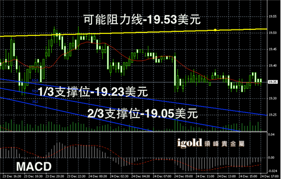 白银阴阳烛录得柱体较短,且整体处于红色 日平均移动线中位,整个过程录得趋势渐稳,短线MACD显示呈中性,整体上白银后期或继续在19.3美元上行窄幅震荡。