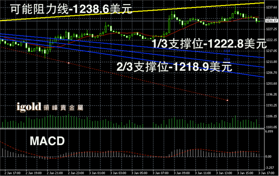 黄金阴阳烛录得柱体收短,且整体处于红色日平均移动线中位,短线MACD显示呈中性,后期黄金价格或继续在1230美元附近持稳。