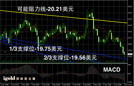 白银阴阳烛录得持稳后,后期小幅回落,柱体低于红色日平均移动线中位,短线MACD显示弱势空头主导,后期白银价格可能继续窄幅回落,直到触及19.8美元附近的支撑位。