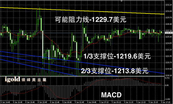 黄金阴阳烛录得下行后,小幅持稳,柱体录得离散率增加,且空头有所消散,短线MACD显示呈中性,黄金价格短线或在1220 – 1230 美元区间小幅持稳。