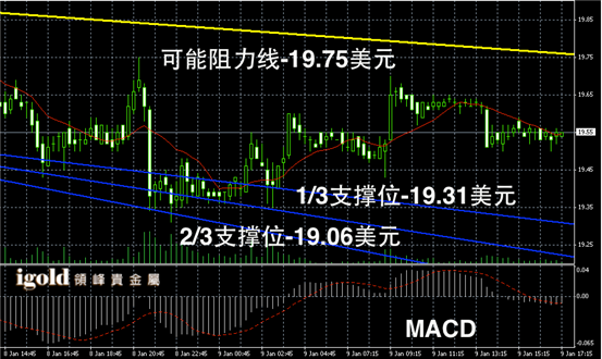 白银阴阳烛录得柱体走跌后,后期阳烛增多,且开始小幅高于红色日平均移动线,短线MACD显示呈中性,白银价格后期或在19.5美元附近持稳震荡。