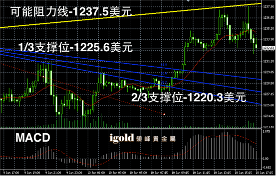黄金阴阳烛录得阳烛增多,后期柱体高于红色日平均移动线,短线MACD显示弱势多头主导,后期黄金价格可能继续在1230美元附近整理震荡。