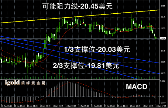 白银阴阳烛录得回落趋势明显,后期阴烛增多,且录得低于红色日平均移动线中位,短线MACD显示弱势空头主导,后期白银价格或下触20美元附近。