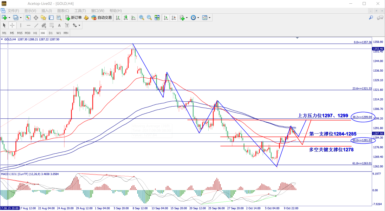 稳健:1280附近做多,止损3美金,目标1284.5-1288-1292-1297附近。