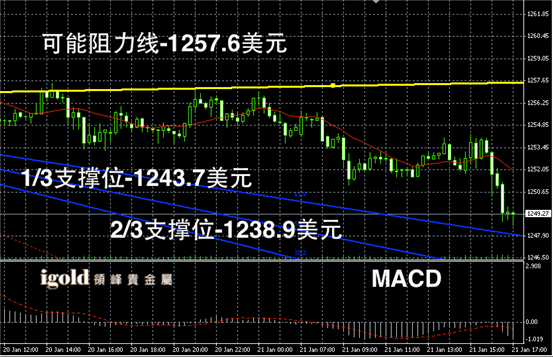 黄金阴阳烛录得后期阴烛增多,且柱体低于红色日平均移动线,短线MACD显示弱势空头主导,后期黄金价格或偏空整理,若跌破1250美元线,则可能继续向1245美元附近回落。