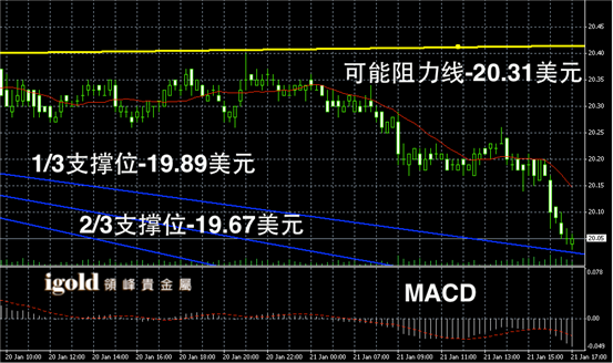 白银阴阳烛录得柱体开始回落,后期阴烛增多,整体处于红色日平均移动线中位,短线MACD显示弱势空头主导,白银价格或在20美元线附近窄幅整理。