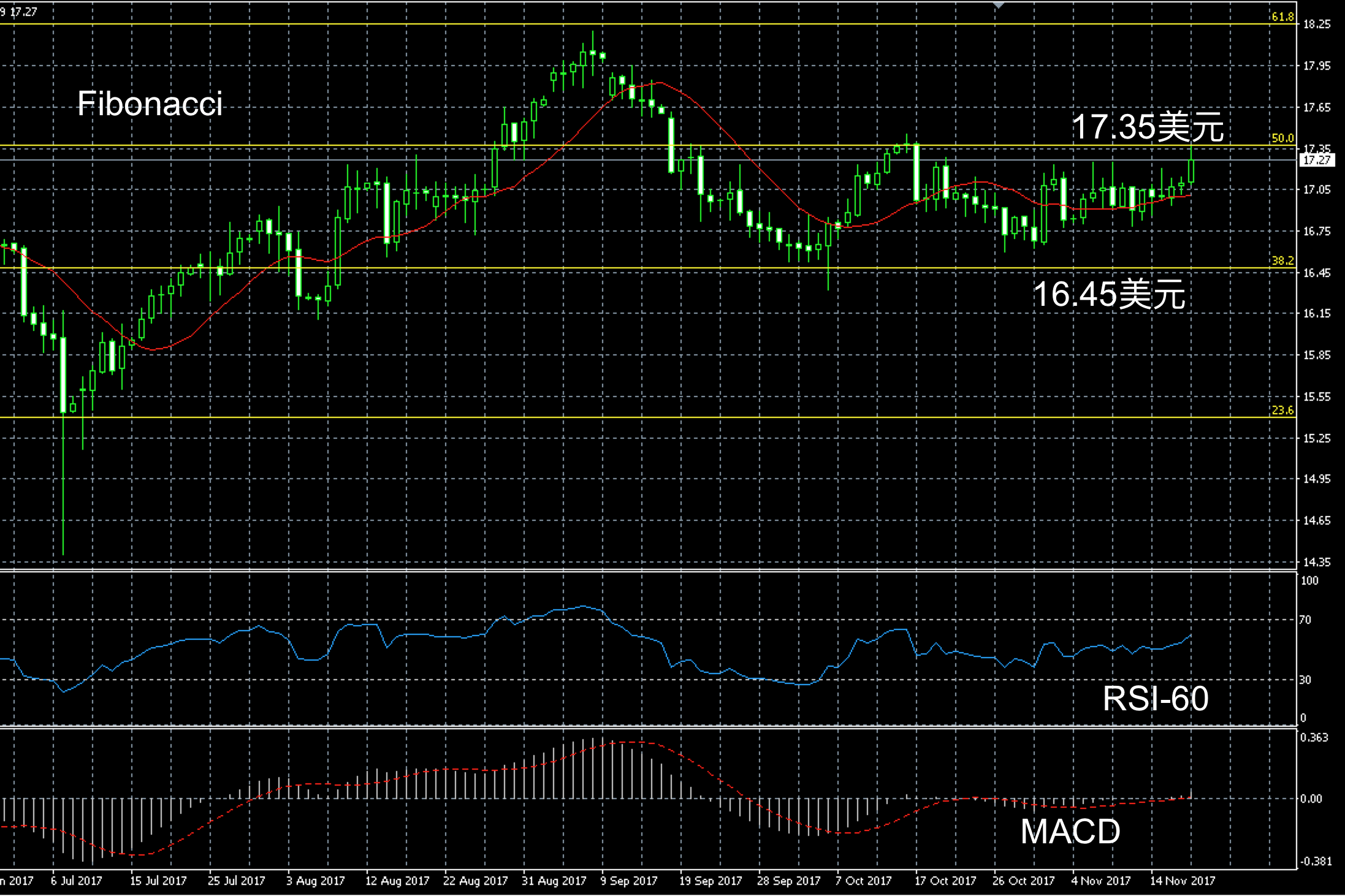 白银日线录得阳烛反弹,柱体高于红色日均线中位,长线MACD显示呈中性,RSI录得60,区间反弹。白银价格未来一周或在Fibonacci第三区间内运行,高位若突破17.35美元附近阻力线,短线多头或进一步增加。