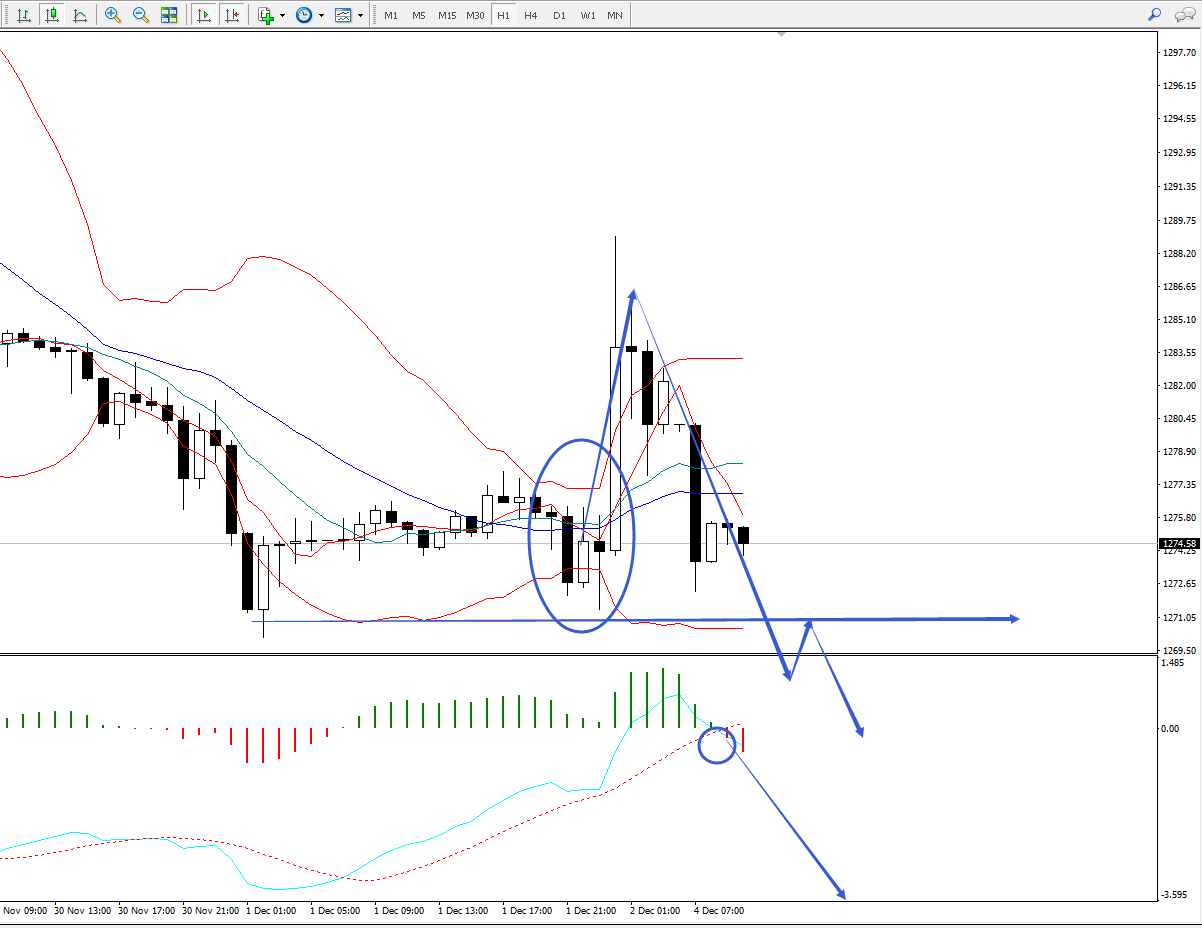 从1小时图来看,目前价格要重点关注1270一线的支撑情况,若有效打破,那么前面的这一波上拉行情技术上则可认定为是一波诱多行情,而且若有效打破,MACD将会出现一个明确的空头信号,价格也将进一步下探去测试下方的一些关键支撑位。
