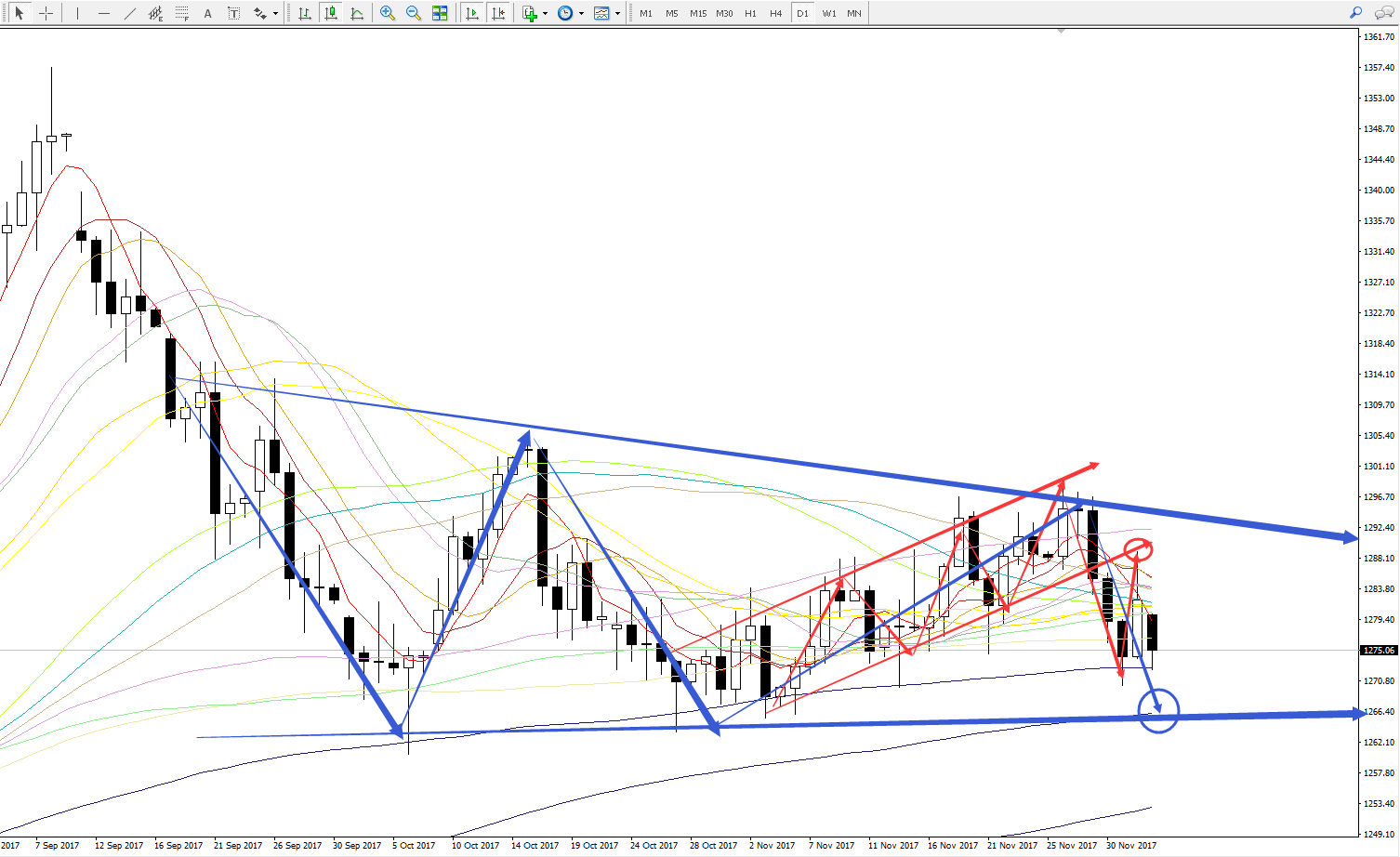 4小时图上,目前周期分别为14、21、26布林轨的中轨区间1282-1286在短线上已经形成一个有效的压力区间,短线上价格若能反弹到这一带,可考虑进行空单的布局。